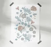 Delicate falene e farfalle che volano e si posano sui fiori. Foglie ondulate si intrecciano con spighe d'erba. È una scena immaginaria che ricorda una bella e calda giornata nella natura, rappresentata in una tavolozza di colori blu, grigio e beige.