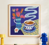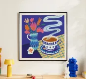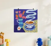 Illustrazione stravagante di una tazza di caffè fumante in una tazza a scacchi blu e bianchi, con fiori stilizzati che fluttuano sopra di essa, su uno sfondo blu scuro e ondulato.