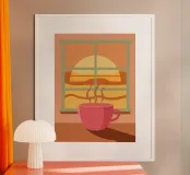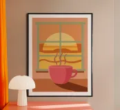 Un'illustrazione semplice e confortante di una tazza rosa di caffè o tè fumante, appoggiata a una finestra con vista sul sole che sorge. La scena cattura perfettamente il calore e la speranza di un nuovo mattino.