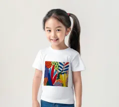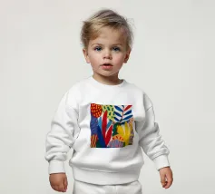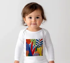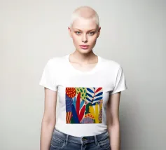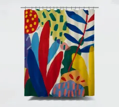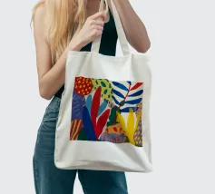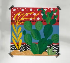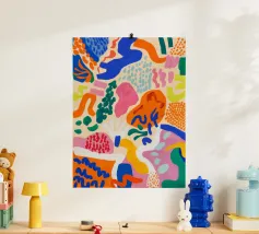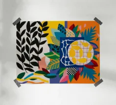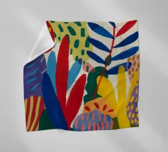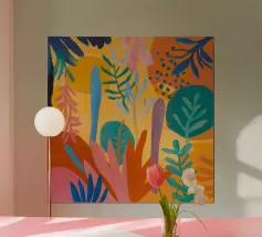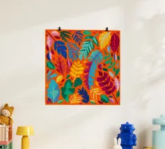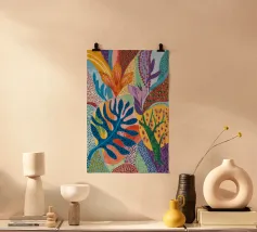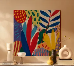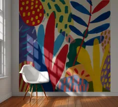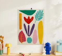 Una composizione dinamica e astratta di forme verticali, che combina foglie stilizzate e forme audaci in una ricca tavolozza di rosso, blu, viola e giallo, creando un senso di energia verso l'alto.