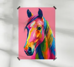 Testa di cavallo in inchiostro nero con vernice dorata e pastelli a olio per lo sfondo color malva.