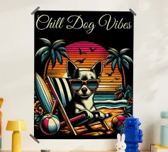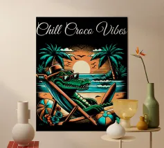 Un capibara rilassato con gli occhiali da sole si sdraia su una spiaggia con un drink tropicale e un vibrante tramonto sullo sfondo. La frase "Chill Vibes Only" è ben visibile accanto al capibara.