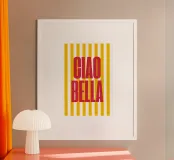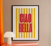 Un design audace ed energico dal titolo "Ciao Bella", con l'iconica frase in caratteri rossi di grande impatto su uno sfondo di strisce gialle vivaci. La combinazione dinamica di rosso caldo e giallo solare conferisce un'energia vivace e allegra all'opera d'arte, creando un punto focale immediato in qualsiasi stanza. Questo design giocoso di ispirazione italiana aggiunge un tocco di colore e personalità, perfetto per chi ama l'arte audace e accattivante. Ideale per cucine, soggiorni o ambienti che necessitano di un tocco di allegria e di stile. Perfetta per l'arte da parete, i poster, l'abbigliamento e molto altro ancora!