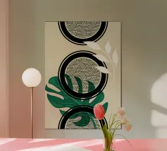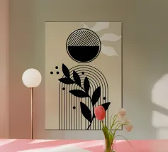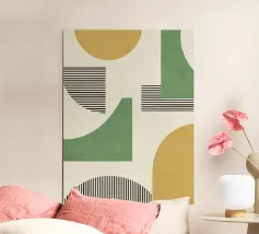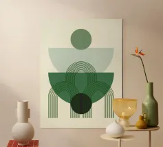 Le forme geometriche nei toni del verde terra sono completate da linee nere decise e da elementi astratti a forma di foglia. La composizione crea un'estetica equilibrata e moderna.