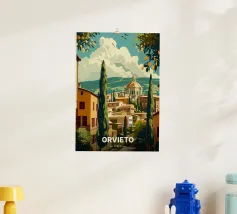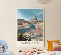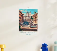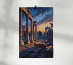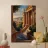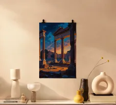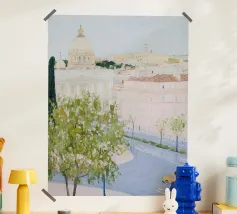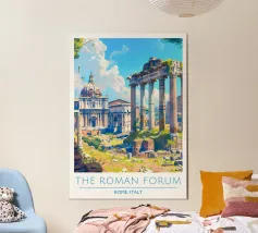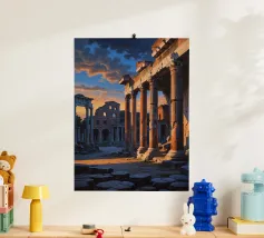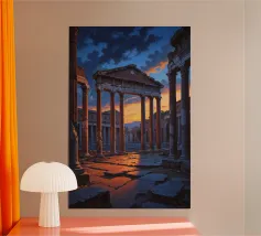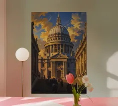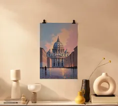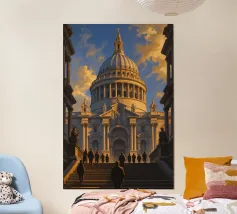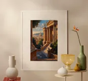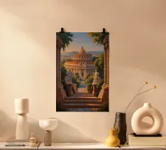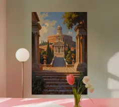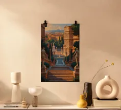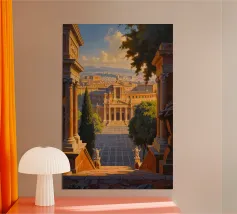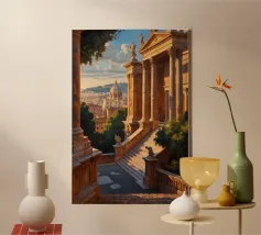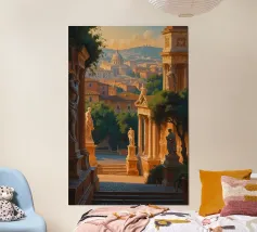 Questa opera d'arte di ispirazione rinascimentale cattura la vista di una grande piazza romana, incorniciata da colonne imponenti e statue intricate. La scena dirige lo sguardo verso una cupola lontana, arroccata su uno sfondo di luce dorata e colline ondulate. L'attenzione ai dettagli evidenzia la maestria dell'architettura, dai capitelli intagliati delle colonne alla struttura dei gradini che salgono verso l'alto. Alberi e fogliame ammorbidiscono la scena, creando un equilibrio tra il naturale e l'artificiale.