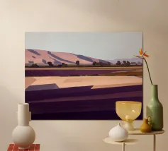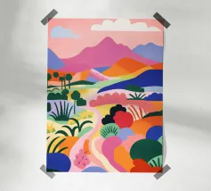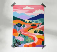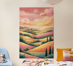 Morbide colline ondulate mostrano ricche sfumature di rosa, arancione e blu, mentre un cielo vibrante pieno di soffici nuvole esalta l'atmosfera tranquilla. Piccoli alberi punteggiano il paesaggio.