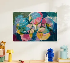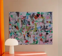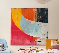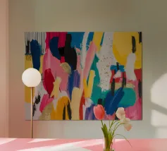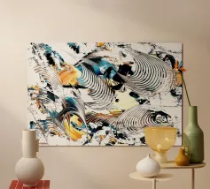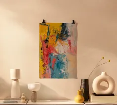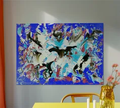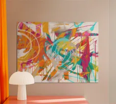 Questo dipinto astratto in acrilico cattura l'energia dinamica della tecnica dell'action painting, ispirata a Pollock. Vibranti schizzi di colore in rosso, giallo, blu e bianco creano linee fluide e motivi complessi che trasmettono movimento e profondità.
