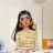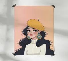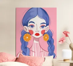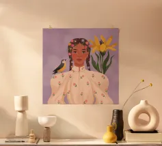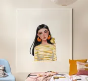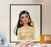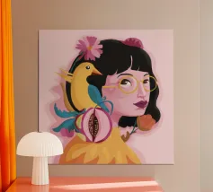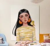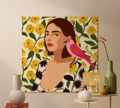 Questo dipinto ritrae una persona che indossa una camicia a righe gialle e bianche con grandi orecchini arancioni. Un piccolo uccello è appollaiato sulla spalla della persona, aggiungendo un elemento affascinante alla composizione.