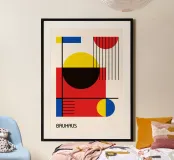 Un dinamico poster astratto Bauhaus che celebra la geometria pura e i colori primari. Il disegno integra magistralmente rettangoli rossi, cerchi gialli e blu e audaci linee nere in una composizione di grande impatto. Gli elementi includono un grande quadrato rosso sovrapposto a un cerchio nero parziale, un cerchio giallo pieno e barre nere verticali che creano tensione visiva. Questo pezzo racchiude magnificamente lo spirito modernista e costruttivista. Questo poster digitale viene fornito con una risoluzione superiore di 7000x5000 pixel a 300 dpi, assicurando una qualità di stampa eccezionale per una dichiarazione audace nei vostri interni moderni.