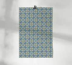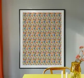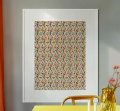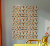 Un motivo vivace e colorato presenta una varietà di forme in rosso, blu, arancione e verde. Ripetuto in modo simmetrico, il disegno crea un ritmo visivo accattivante.