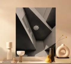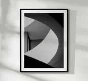 Poster in bianco e nero di architettura minimalista: curve organiche e spigoli vivi fotografati sotto una scala a chiocciola, vicino a una finestra. Il contrasto tra aree chiare e ombre profonde scolpisce una composizione fluida, geometrica e senza tempo, con delicate texture di stucco. Un elegante poster da parete che porta movimento, calma e modernità in salotto, camera da letto o ufficio, in stile contemporaneo, scandinavo, japandi o wabi-sabi.