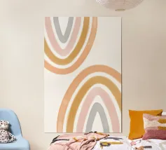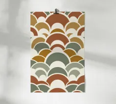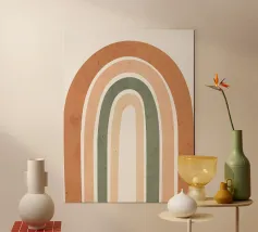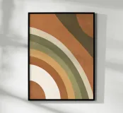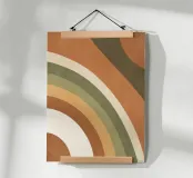 Un'opera d'arte astratta nostalgica con linee curve e fluide in arancione polveroso, giallo, verde salvia, marrone, beige e bianco. Ispirata al design degli anni '60 e '70, aggiunge un caldo tocco retrò a interni moderni, boho o eclettici.