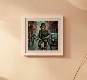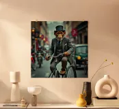 Scimmia su una bicicletta da un centesimo in una strada vittoriana Un'affascinante scimmia in abito a tre pezzi si muove in una vivace strada dell'epoca vittoriana su una bicicletta vintage da un centesimo, con colori vividi e dettagli nitidi che ricordano l'arte iperrealista.
