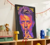 Un uomo si porta il dito alle labbra per segnalare il silenzio, sotto una suggestiva illuminazione al neon con il nome "DAVID BOWIE" sullo sfondo.