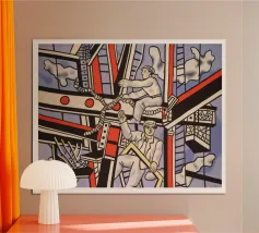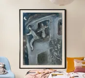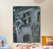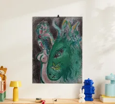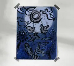 Questa litografia di Marc Chagall illustra una scena biblica, probabilmente raffigurante il re Davide che fugge da una finestra mentre la moglie Michal fa la guardia. Eseguita nella caratteristica tavolozza blu, grigia e bianca di Chagall, cattura un momento di dramma, lealtà e passione. Le figure sognanti e fluttuanti e la semplice ambientazione architettonica trasmettono una narrazione emotiva e senza tempo.