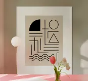 Una disposizione astratta di forme geometriche su sfondo beige, con semicerchi, linee e triangoli. Il design è semplice ma audace, con contorni neri che creano un contrasto sorprendente.