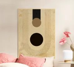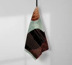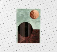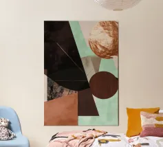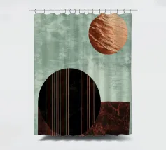 Design astratto e minimalista con forme geometriche in marrone, verde menta, rame e nero. Un grande cerchio di rame a sinistra, linee verticali sottili e superfici strutturate ricordano la pietra o il marmo. Disposte in modo armonico con un'estetica moderna e chiara.