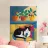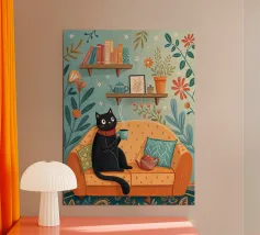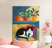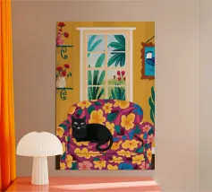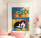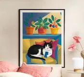 Un'illustrazione affascinante e accogliente di un gatto "smoking" bianco e nero che dorme pacificamente su un divano giallo, circondato da piante in vaso. L'opera d'arte cattura la gioia semplice e tranquilla di un pisolino.