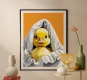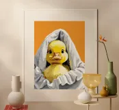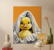Un simpatico anatroccolo fa capolino da sotto un morbido asciugamano bianco. Le sue soffici piume gialle e i suoi occhi curiosi creano una scena adorabile e affascinante.