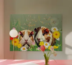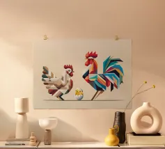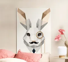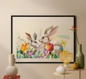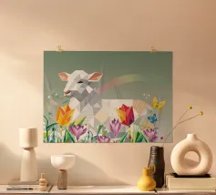 Due coniglietti pasquali stilizzati tra fiori colorati, pulcini e farfalle: un motivo allegro in stile poligonale, ideale per il periodo pasquale e l'inizio della primavera. Due coniglietti geometrici come motivo centrale Fiori primaverili colorati e crochi Inclusi simpatici pulcini e farfalle svolazzanti Design moderno e giocoso per la Pasqua Ideale per prodotti stagionali dal sapore primaverile
