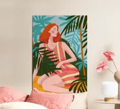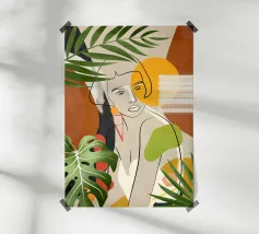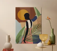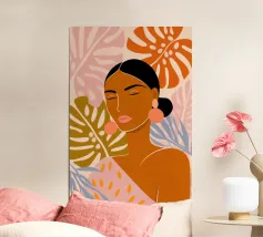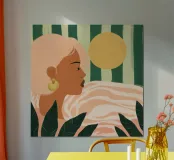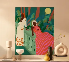Un bellissimo ritratto stilizzato di due volti di donna di profilo, leggermente sovrapposti. I colori caldi e tenui e lo sfondo a righe creano un'opera d'arte delicata e intima che parla di legami e identità.