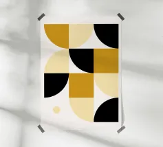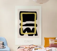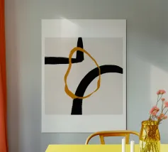 Audaci curve nere si intrecciano con un vibrante quadrato dorato al centro, creando una composizione dinamica e astratta. Il gioco di contrasti tra luce e buio aggiunge profondità e movimento al disegno.