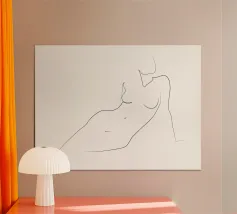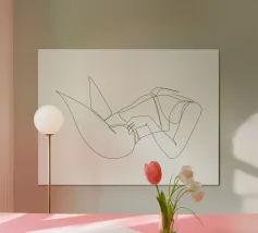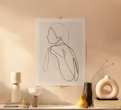 Un'illustrazione line art minimalista dal titolo. Cattura un momento tranquillo e introspettivo - l'equilibrio tra forza e vulnerabilità. Perfetta per interni moderni che abbracciano la quiete, la grazia e l'arte della semplicità.