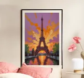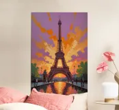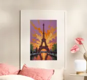 Un'interpretazione artistica della Torre Eiffel immersa in radiosi toni arancioni e viola, questo dipinto a olio fa rivivere la grandezza delle serate parigine. La torre si staglia maestosa contro un cielo ricco di sfumature, mentre il canale sottostante rispecchia la sua bellezza. Gli alberi e i sentieri incorniciano la composizione, guidando lo sguardo dell'osservatore verso il monumento illuminato. Perfetto per gli ammiratori dell'impressionismo e gli amanti di Parigi, questo pezzo celebra la fusione di natura, architettura e arte.