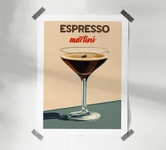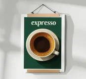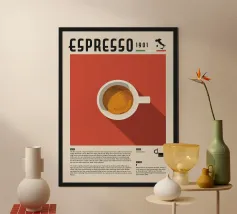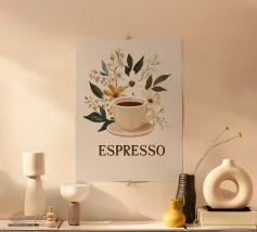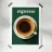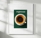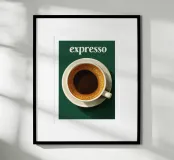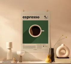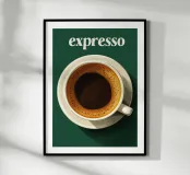Vista dall'alto di un espresso ricco di crema in una tazza bianca su sfondo verde intenso con scritte vintage in grassetto. Questa accogliente stampa sul caffè conferisce un fascino da bar alle cucine, alle sale da pranzo e agli angoli caffè. Perfetta per gli angoli barista di caffè e ristoranti. Si abbina facilmente con piastrelle bianche, accenti in legno scuro e ottone e colori neutri caldi per un'atmosfera mattutina raffinata.