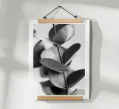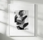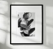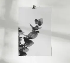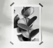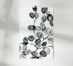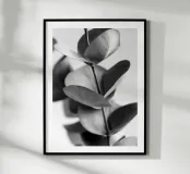 Poster botanico in bianco e nero che mostra un primo piano di un ramo di eucalipto: foglie rotonde con venature sottili, luce soffusa e sfondo pulito. Un poster da parete minimalista che aggiunge un tocco naturale, rilassante ed elegante alle pareti. Perfetto per il soggiorno, la camera da letto o l'ufficio, si abbina a stili contemporanei, scandinavi, japandi o boho chic e si integra con palette neutre e materiali naturali.
