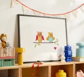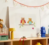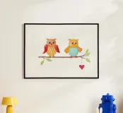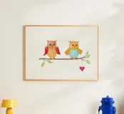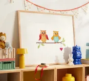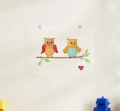 Simpatici gufi dipinti ad acquerello su un ramo con un cuore allegato.