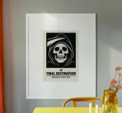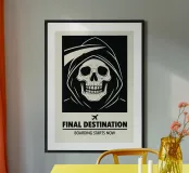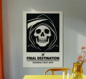 Stampa Final Destination, Poster cinematografico alternativo, Bianco e nero, Arte da parete minimale, Teschio, Morte, Mietitore, Volo, Imbarco, Regalo per fan del cinema