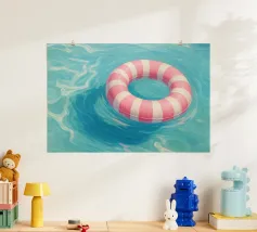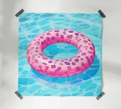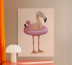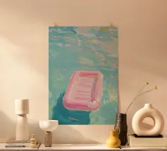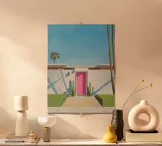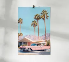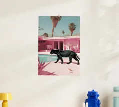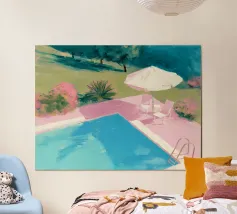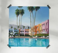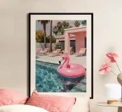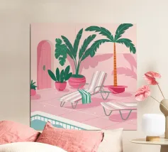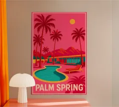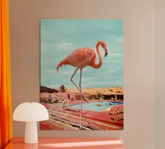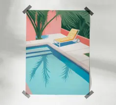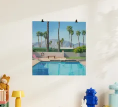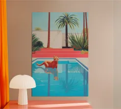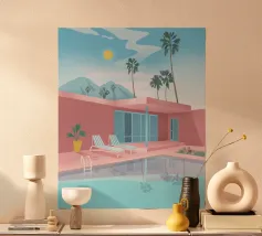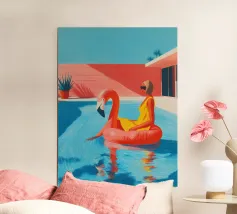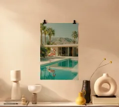 Una scena nostalgica di Palm Springs: un fenicottero rosa che nuota alla deriva in una piscina turchese, incorniciata da morbidi lettini pastello e palme svettanti. Quest'opera d'arte conferisce uno spirito estivo retrò, un'atmosfera vacanziera rilassata e un fascino di metà secolo a qualsiasi parete, ideale per soggiorni, camere da letto o per un arredamento elegante a bordo piscina.