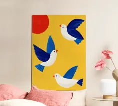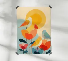 Uccelli azzurri in volo in primavera tra fiori e sole.