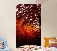 La luce dorata del sole filtra attraverso le vibranti foglie autunnali, creando un'atmosfera calda e serena in un ambiente naturale. I ricchi colori delle foglie esaltano la bellezza della scena.