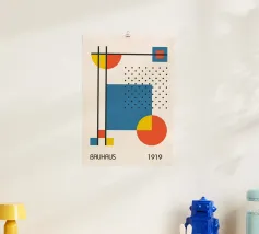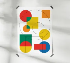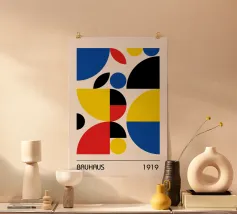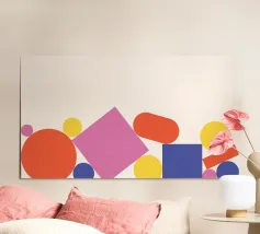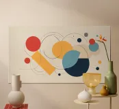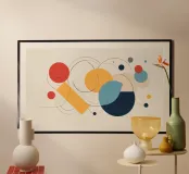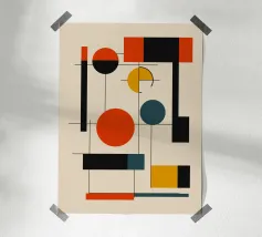 L'opera d'arte presenta una disposizione dinamica di forme geometriche dai colori vivaci. Cerchi, rettangoli e linee si intrecciano, creando un senso di movimento ed equilibrio.