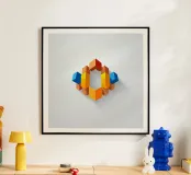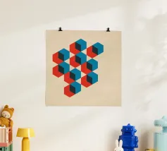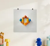 Una vivace disposizione di forme geometriche in vari colori crea un disegno intrigante su uno sfondo di luce soffusa, sottolineando l'arte e la creatività moderne.