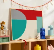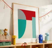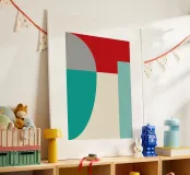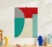 Un'audace composizione astratta con forme geometriche nei toni del rosso, del verde acqua, del grigio e del beige. Il design è semplice e moderno e mette in risalto il contrasto di colori.