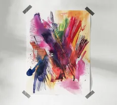 In quest'opera a tecnica mista, forme frammentate e colori dinamici suggeriscono un movimento catturato nel tempo. Il gioco di texture e toni crea un'esplosione di energia, congelata a metà del movimento, aggiungendo un senso di profondità e flusso alla composizione.