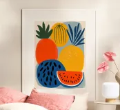 Frutta fresca e colorata da afferrare: Questa vibrante composizione unisce i frutti tropicali in un insieme armonioso. La tavolozza vibrante - arancione brillante, giallo solare, blu profondo e verde lussureggiante - trasmette una voglia di vita mediterranea. Le forme stilizzate oscillano tra astrazione e figurazione: melone, ananas, arancia e frutti esotici sono disposti in uno splendore decorativo. Lo stile pittorico bidimensionale e i motivi grafici mostrano influenze del design scandinavo e dei Papiers découpés di Matisse. Vitamine per gli occhi e puro umorismo estivo per ogni parete.