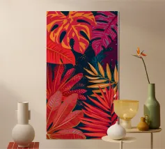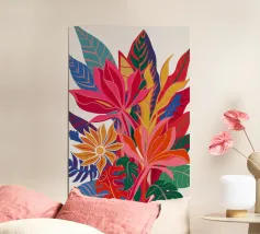 Una composizione astratta che fonde elementi floreali stilizzati con audaci forme geometriche in una vibrante tavolozza di blu, gialli, arancioni e verdi, creando una dichiarazione artistica dinamica e moderna.