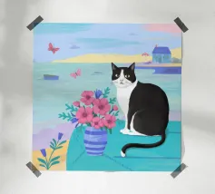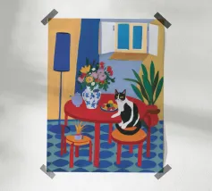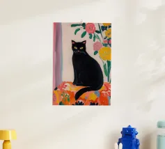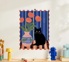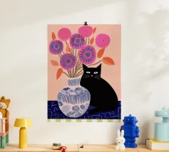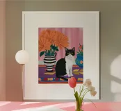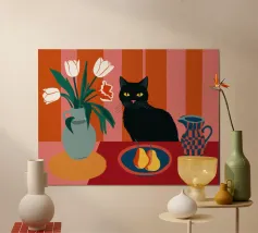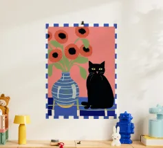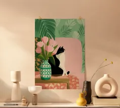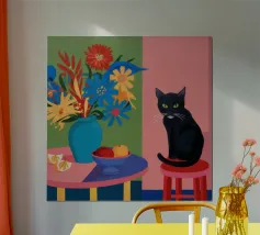 Un gatto bianco e nero siede regalmente dietro un grande vaso di fiori con motivi a strisce vivaci, sullo sfondo di una tenda rosa, creando una natura morta suggestiva e affascinante.