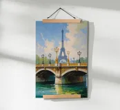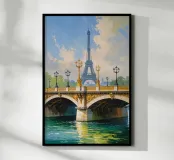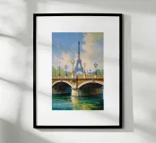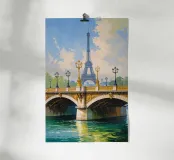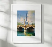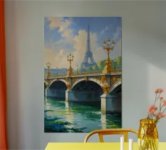 Un magnifico dipinto impressionista che mostra la Torre Eiffel sullo sfondo, incorniciata dall'ornato ponte dorato che attraversa la Senna. Le calme acque sottostanti riflettono gli intricati dettagli dei lampioni e delle sculture dorate. Il cielo azzurro, punteggiato da soffici nuvole, crea un'atmosfera parigina serena e incantevole. La luce dorata esalta il fascino senza tempo del ponte, fondendosi magnificamente con la silhouette iconica della Torre Eiffel. Una celebrazione dell'eleganza architettonica e della bellezza naturale.