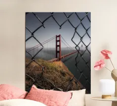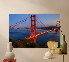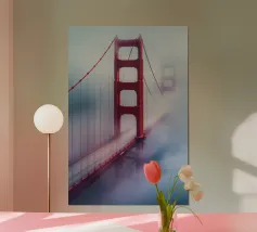 Il Golden Gate Bridge risplende dolcemente attraverso un velo di nebbia fitta, con le sue torri rosse che si ergono risolute tra la foschia eterea. Le luci sottili che punteggiano il ponte ne esaltano la struttura, creando un'aura quasi magica mentre la nebbia lo avvolge per tutta la sua lunghezza. Questa scena iconica incarna perfettamente il fascino del clima di San Francisco, fondendo l'ingegno umano con la serena imprevedibilità della natura. Il gioco di luci, colori e nebbia rende questa rappresentazione accattivante e senza tempo del famoso punto di riferimento.
