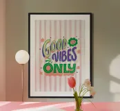 Diffondete la positività con questa divertente e vivace stampa digitale che riporta la frase motivazionale "GOOD VIBES ONLY". La scritta è resa in uno stile giocoso e sovrapposto, utilizzando una tavolozza luminosa e contrastante di viola, verde e giallo, accentuata da stelle stravaganti, fulmini e un'icona floreale sorridente. Lo sfondo è caratterizzato da morbide strisce bianche e rosa disegnate a mano con un'affascinante texture acquerellata. Questo pezzo è perfetto per aggiungere un tocco di colore, una dose di estetica retrò anni '70 e un messaggio positivo a una camera da letto, un ufficio o una parete della galleria. Offerto come file digitale di qualità superiore (7000x5000).