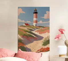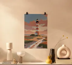Questo rendering artistico del faro di Hörnum gioca con ombre drammatiche e motivi astratti per creare un irresistibile senso di profondità. Il contrasto tra le sue audaci strisce bianche e rosse e il tenue sfondo modernista ne accresce il fascino visivo. La composizione esalta la grandezza architettonica del faro, mentre l'approccio stilizzato gli conferisce un tocco contemporaneo, rendendolo un'aggiunta accattivante alle collezioni di opere d'arte ispirate al mare.