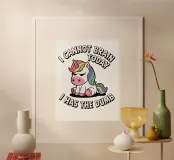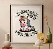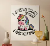 Un simpatico unicorno con una criniera arcobaleno siede circondato da stelle, accompagnato dal testo umoristico "Oggi non posso fare il cervello, ho il muto". L'immagine è collocata su uno sfondo semplice.
