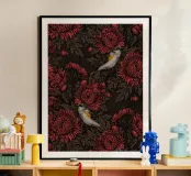 Fiori di crisantemo e uccelli codirosso dipinti a mano