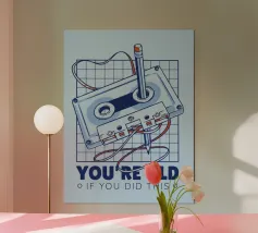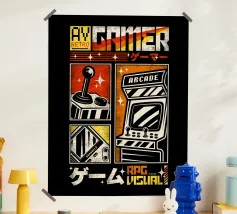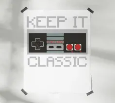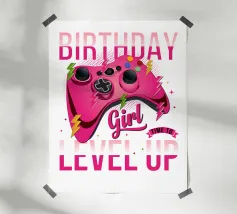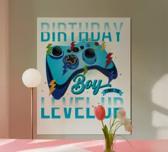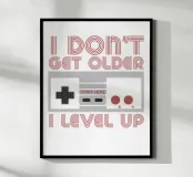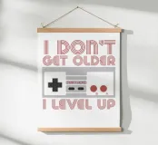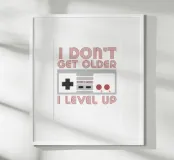 Un controller di gioco retrò è accompagnato dalla frase "Non invecchio, salgo di livello", utilizzando uno stile di carattere nostalgico. Questo design combina la cultura del gioco vintage con una visione umoristica dell'invecchiamento.