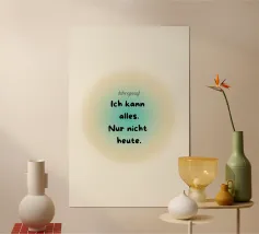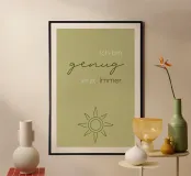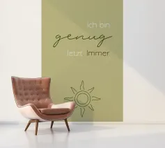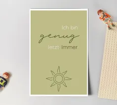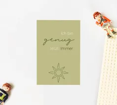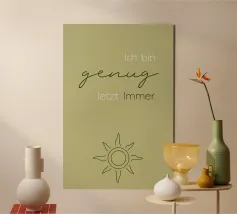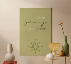 Un dolce promemoria pieno di amore per se stessi. Questo motivo porta pace interiore e accettazione nella stanza. I morbidi toni del verde hanno un effetto di radicamento e armonia, perfetto come promemoria quotidiano: sei abbastanza, così come sei. Fa parte della collezione Calm Mind di Spruch drauf.